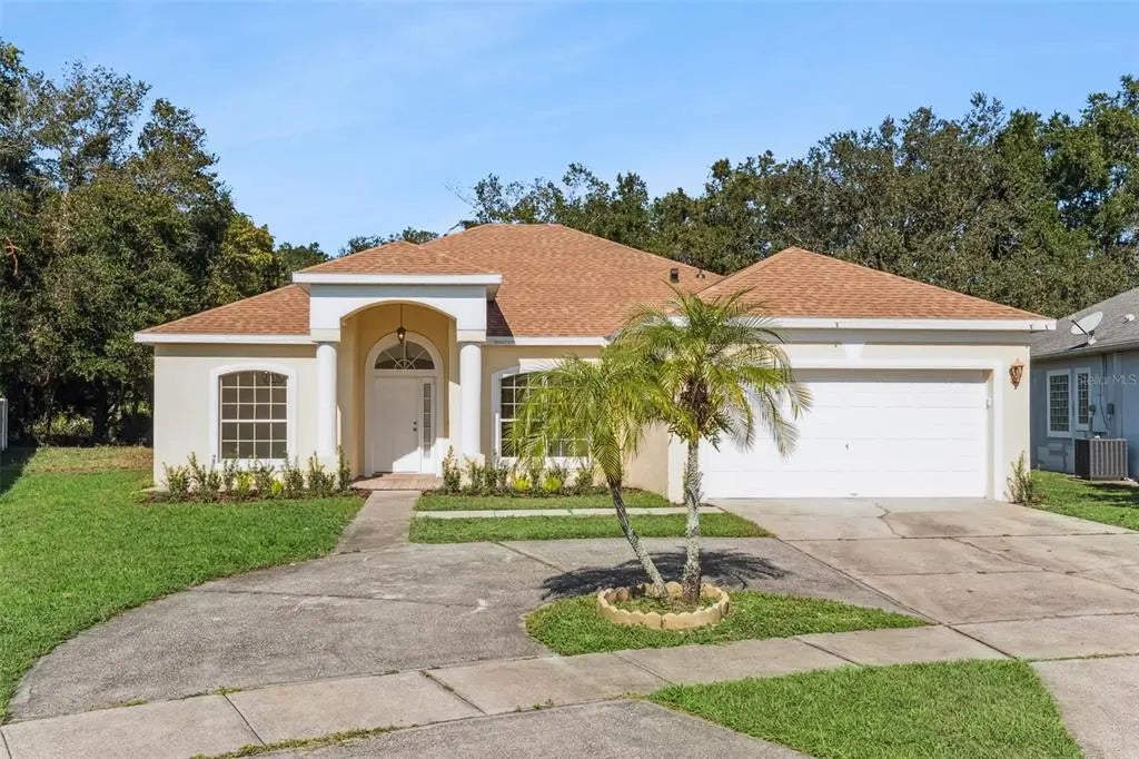 This beautifully updated single-story home offers 3 spacious bedrooms and 2 modern bathrooms across 1,847 square feet of living space. Recent upgrades include a new roof, well-appointed kitchen with quartz counters, new appliances, elegantly updated bathrooms, and AC system, ensuring comfort and peace of mind for years to come. The open floor plan is enhanced by cathedral and vaulted ceilings, creating a bright and airy atmosphere throughout. A split-bedroom layout provides privacy, with the primary suite serving as a serene retreat, complete with elegant crown molding and a bathroom en-suite with a luxury soaking tub, dual sinks and an oversized walk-in closet. The circular driveway adds curb appeal and convenience, complemented by a roomy 2-car garage. Durable tile flooring flows throughout the home with wood laminate in the additional 2 bedrooms. Situated on a generous 0.28-acre lot in a welcoming neighborhood ideal for comfortable living, this home blends timeless charm with thoughtful updates.